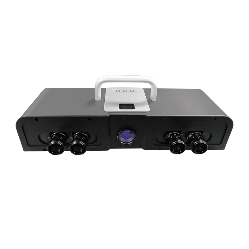 The 3DOE 3D measuring head is composed of two high-resolution industrial CCD cameras on the left and right and a grating projection unit. The structured light measurement method is used to project a group of grating fringes with phase information onto the surface of the measured object using the grating projection unit. The two cameras on the left and right can measure simultaneously, and combine computer vision technology, photoelectric sensor technology, image processing technology and software control technology to obtain high-density three-dimensional data on the surface of the object in a very short time. The rotating object or scanning head is used to change the scanning angle of view. Based on the automatic splicing technology of multi-view point cloud, it can complete 360° scanning of the object in all directions.